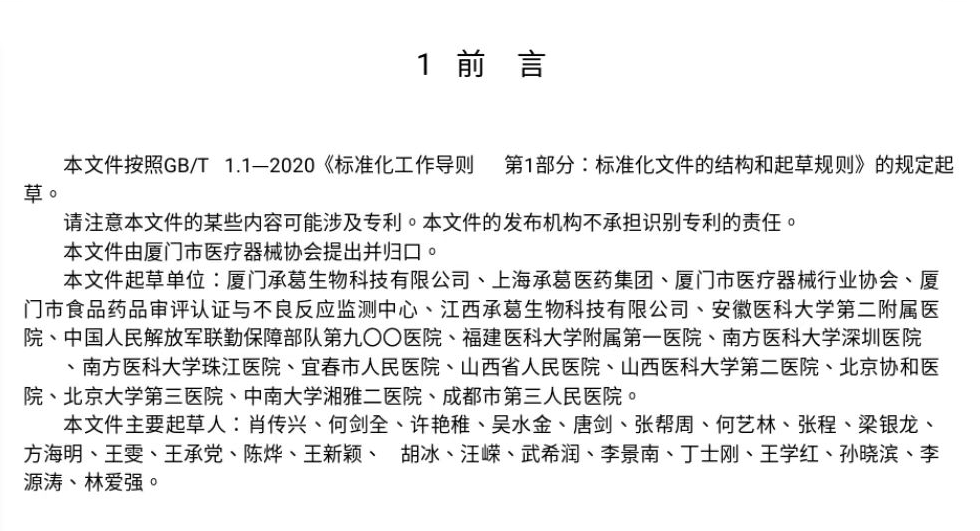 據了解,五項團體標準是由上海承葛醫(yī)藥集團牽頭起草,聯(lián)合廈門承葛生物科技有限公司、廈門市醫(yī)療器械行業(yè)協(xié)會、廈門市食品藥品審評認證與不良反應監(jiān)測中心、江西承葛生物科技有限公司、安徽醫(yī)科大學第二附屬醫(yī)院、中國人民解放軍聯(lián)勤保障部隊第九00醫(yī)院、福建醫(yī)科大學附屬第一醫(yī)院、南方醫(yī)科大學深圳醫(yī)院、南方醫(yī)科大學珠江醫(yī)院、宜春市人民醫(yī)院、山西省人民醫(yī)院、山西醫(yī)科大學第二醫(yī)院、北京協(xié)和醫(yī)院、北京大學第三醫(yī)院、中南大學湘雅二醫(yī)院、成都市第三人民醫(yī)院等16家單位參與制定。承葛醫(yī)藥集團董事長肖傳興作為標準主要起草人之一。