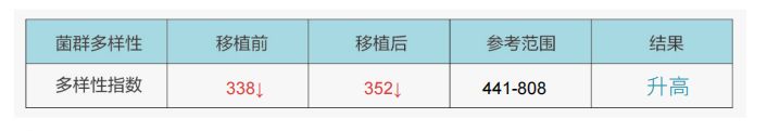 從下圖可以看出,患者移植后腸道菌群多樣性指數(shù)由338提升至352,移植后腸道菌群多樣性有所升高。
